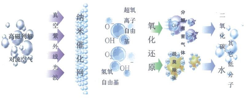 二、 先利于超强高磁对流对有机废气或无机废气进行快速列解分裂打短,再利用高能高臭氧UV紫外线光束分解空气中的氧分子产生游离氧,即活性氧,因游离氧所携正负电子不平衡所以需与氧分子结合,进而产生臭氧,最后通过臭氧发生器制造足够的氧离子对废气进行氧化,达到让废气生成二氧化碳和水的效果。有机废气→对流高磁+光解臭氧发生器制造足够的氧离子对废气进行氧化,达到让废气生成二氧化碳和水的效果。有机废气→对流高磁+光解+高压点解+O2→O3→CO2+H2O(达标排放),众所周知臭氧对有机物具有极强的氧化作用,对恶臭气体及其它刺激性异味有立竿见影的清除效果。